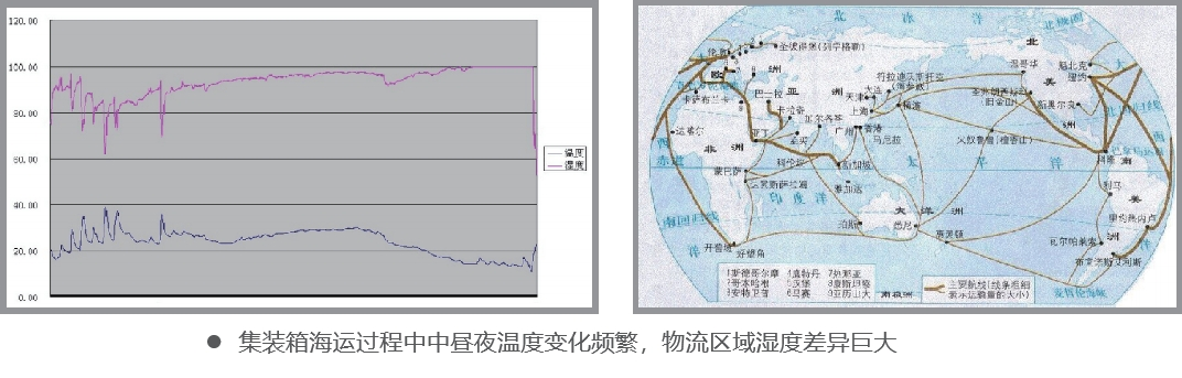 集裝箱運輸物流過程中的濕損發生是由于集裝箱所處環境溫度、濕度的明顯變化引起的。如貨物遠距離運輸中晝夜溫度的變化,物流區域濕度差異等。