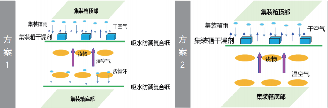 物流業或產品制造商一般(ban)采(cai)用(yong)的解決方案為20英(ying)尺(chi)的(de)(de)集(ji)裝使用(yong)16千克(ke)的(de)(de)干燥劑,40英(ying)尺(chi)的(de)(de)集(ji)裝箱(xiang)使用(yong)32千克(ke)的(de)(de)干燥劑(在25℃、RH=80%的(de)(de)條(tiao)件下的(de)(de)吸濕率為35%)。因使用(yong)干燥劑僅吸收(shou)氣態(tai)水,目前該方案無法解決和避免因集(ji)裝箱(xiang)霧(wu)雨所(suo)導致的(de)(de)商品濕損(sun)。